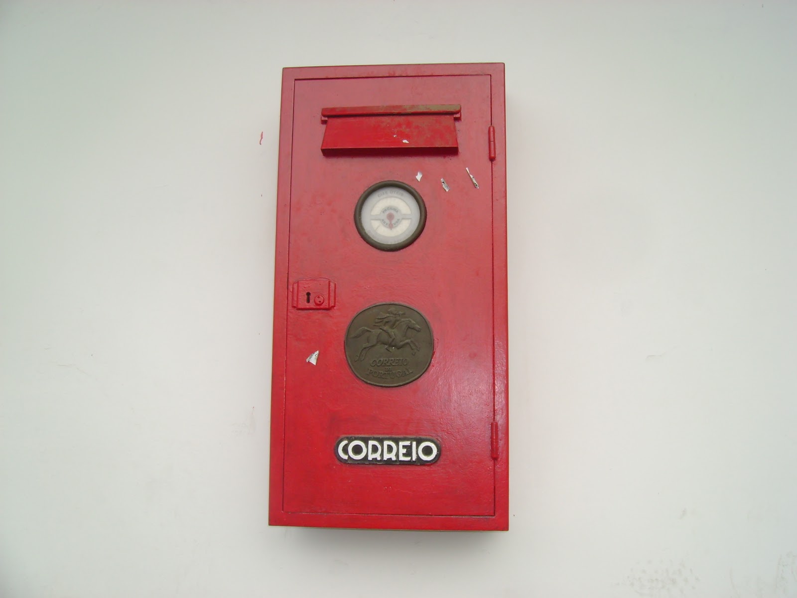 | Um marco do correio (à moda antiga) aposto na frontaria exterior da estação ferroviária. |