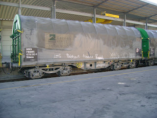 | Vagões espanhois do tipo "Shimms" (máximo de cem quilómetros/hora) e se destinam ao transporte de produtos siderúrgicos. |