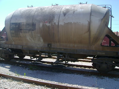 | Vagão cimenteiro, que pertence à operadora espanhola "Transfesa". |